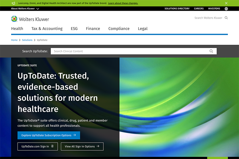 • UpToDate by Wolters Kluwer: Provides evidence-based clinical content for decision support.