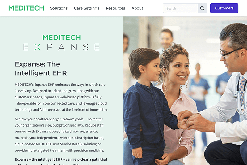 • Meditech Expanse: A full-featured EHR system covering various care aspects, from the emergency department to home health.